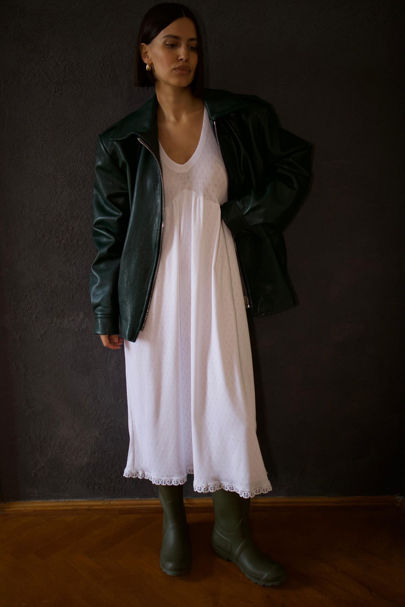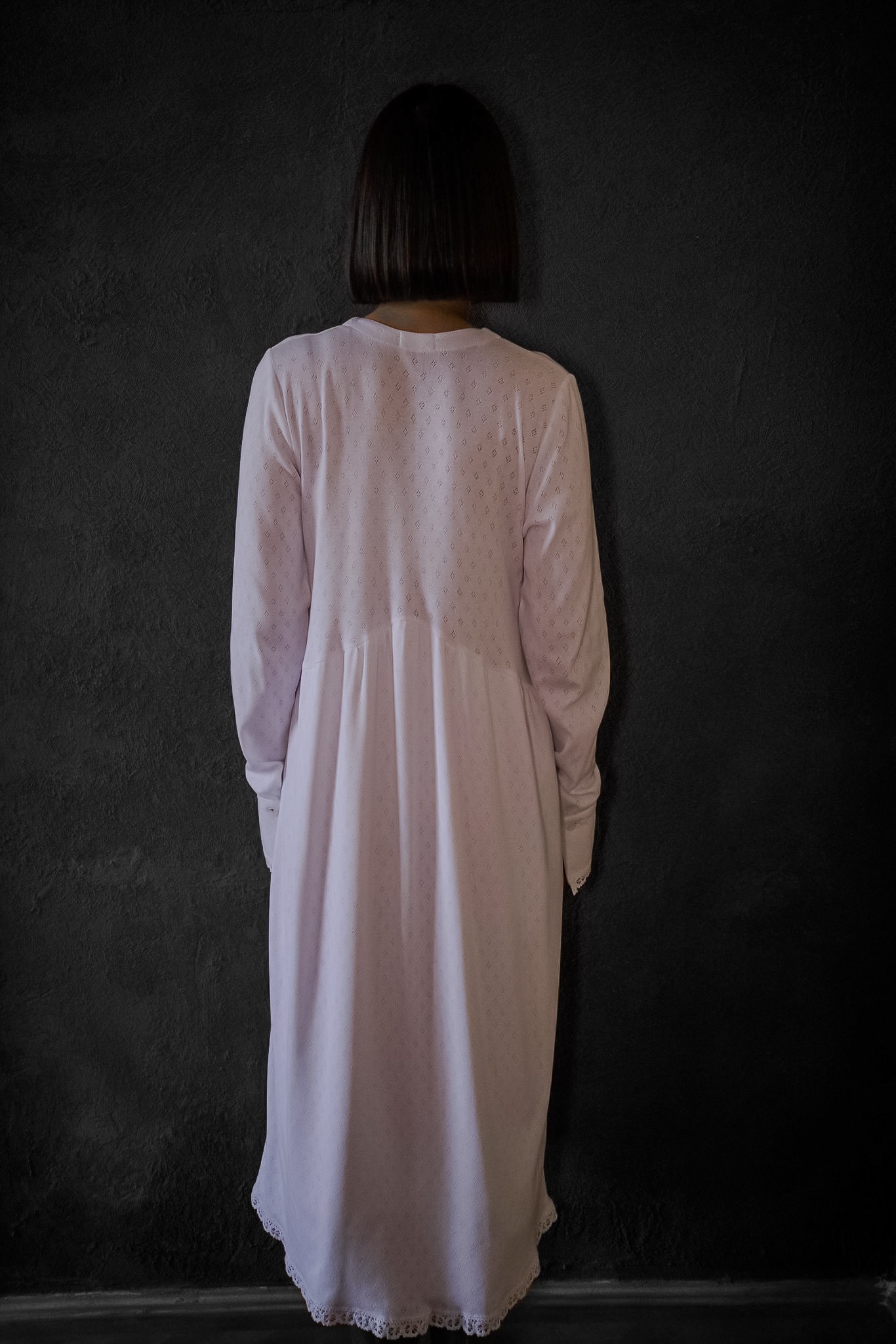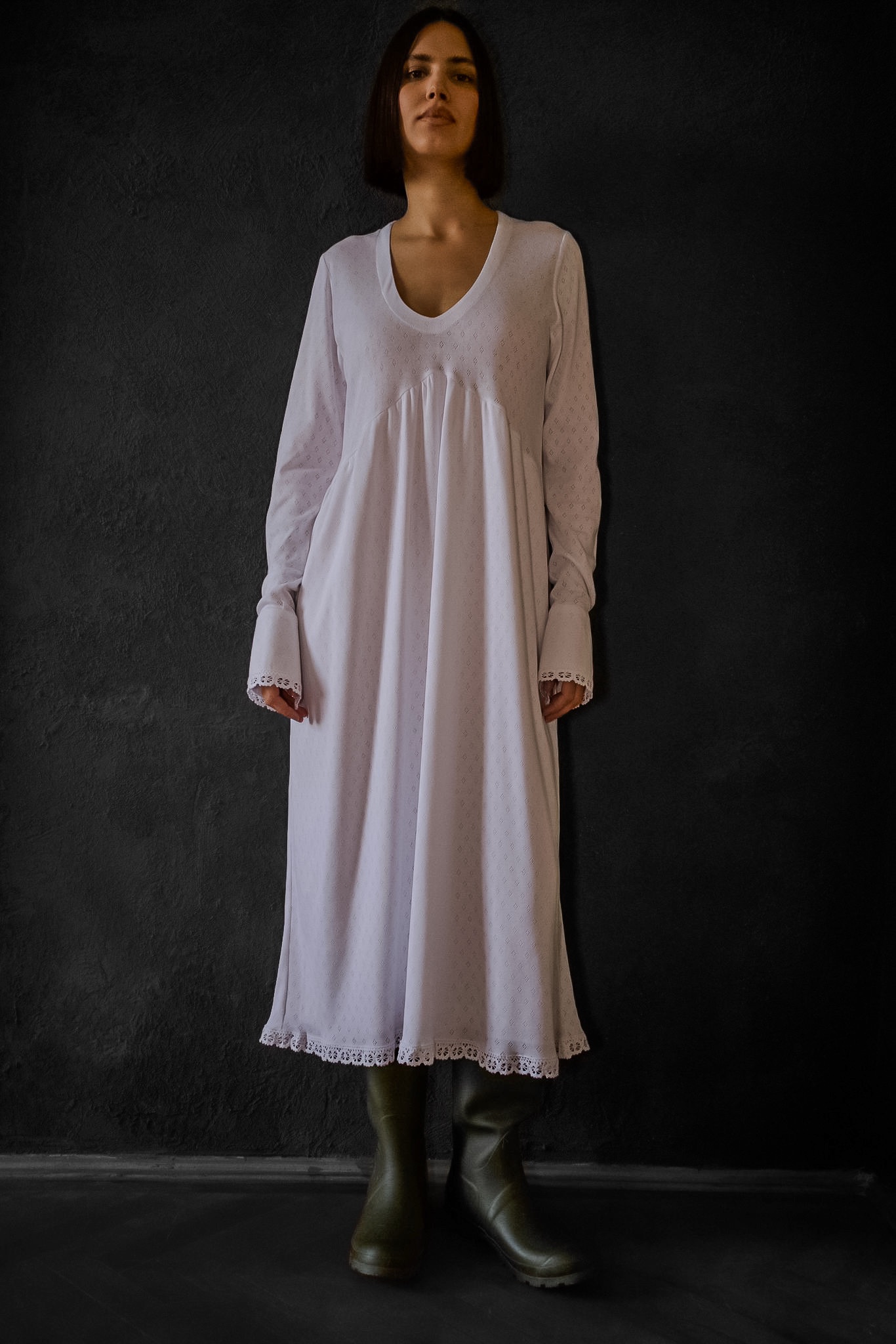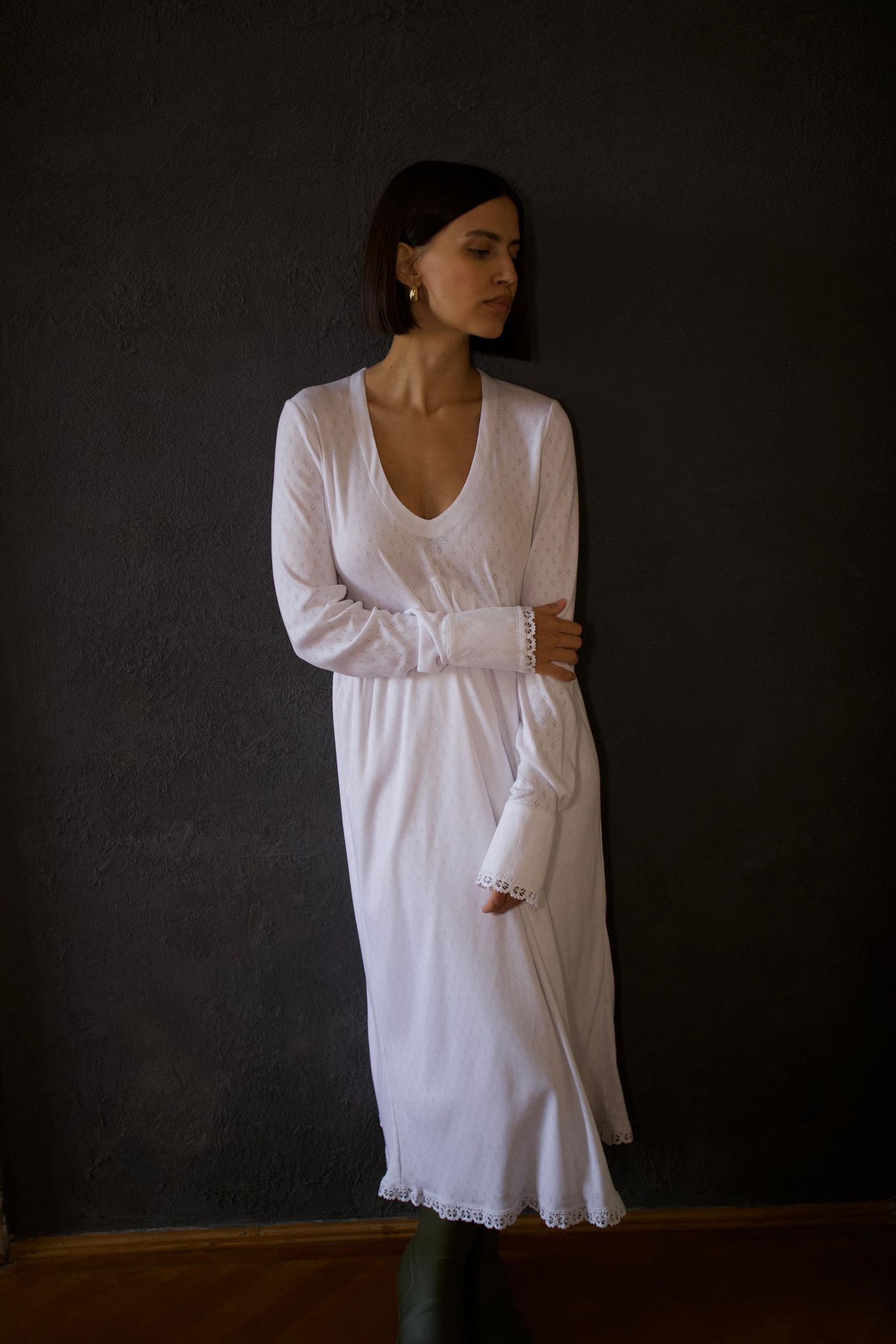 Creată din tricot 100% bumbac, Rochia Alba Luna – White surprinde esența purității și a simplității elegante. Fusta căptușită cu bumbac și broderia delicată de la tiv și manșete aduc un aer romantic, feminin și atemporal.