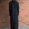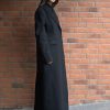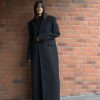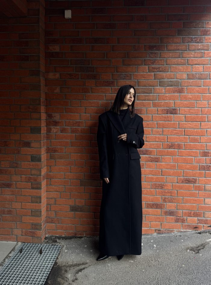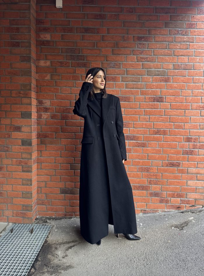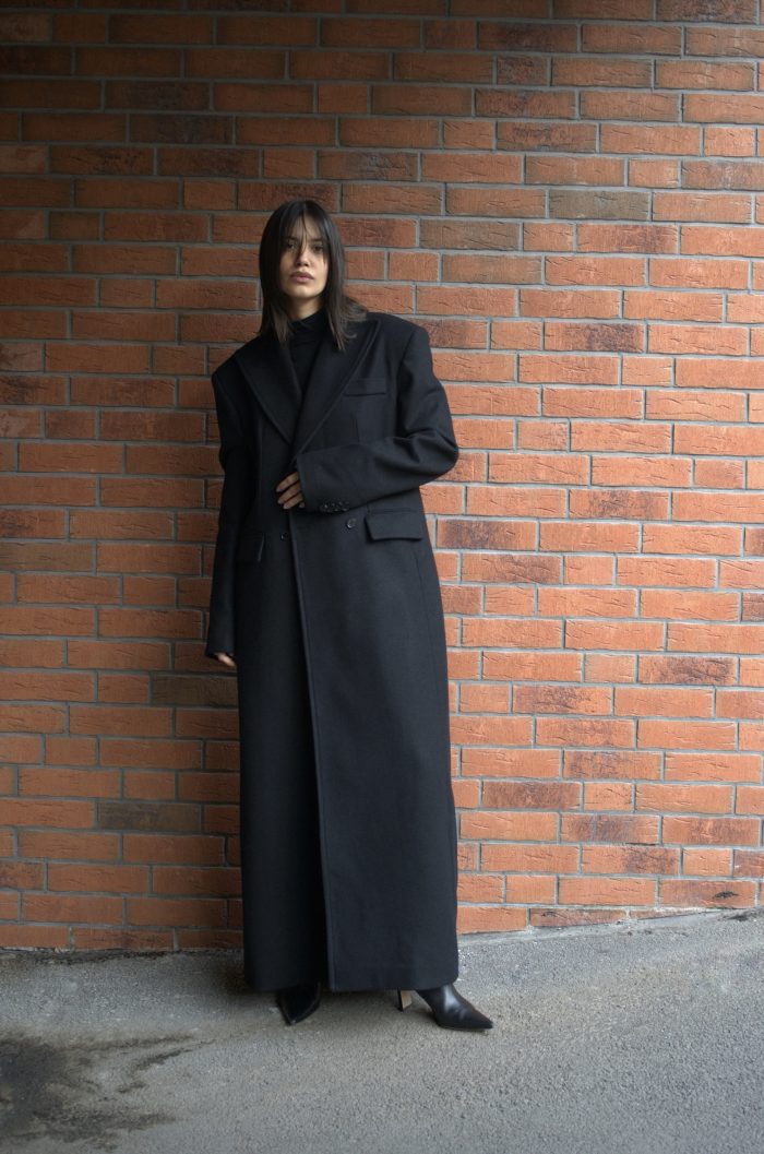 Palton lung cu revere de sacou si umeri supradimensionati.