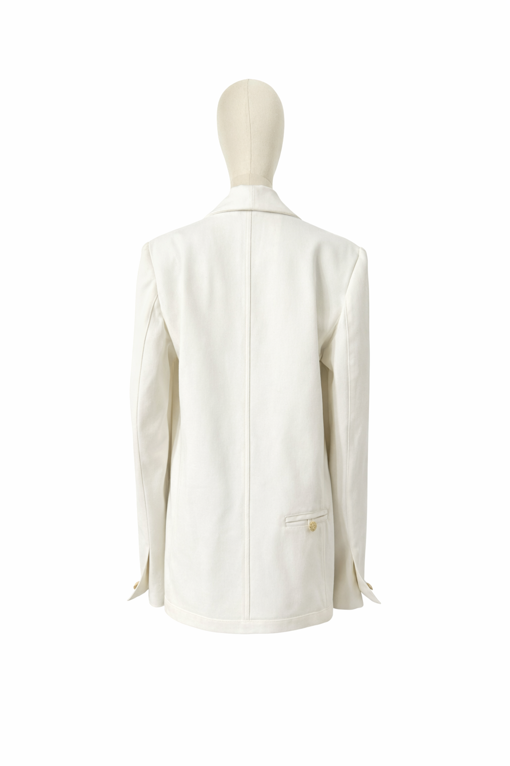 Spatele este construit cu o linie centrală pentru o formă echilibrată, iar mânecile sunt finisate cu detalii delicate și nasturi metalici, menținând coerența designului.