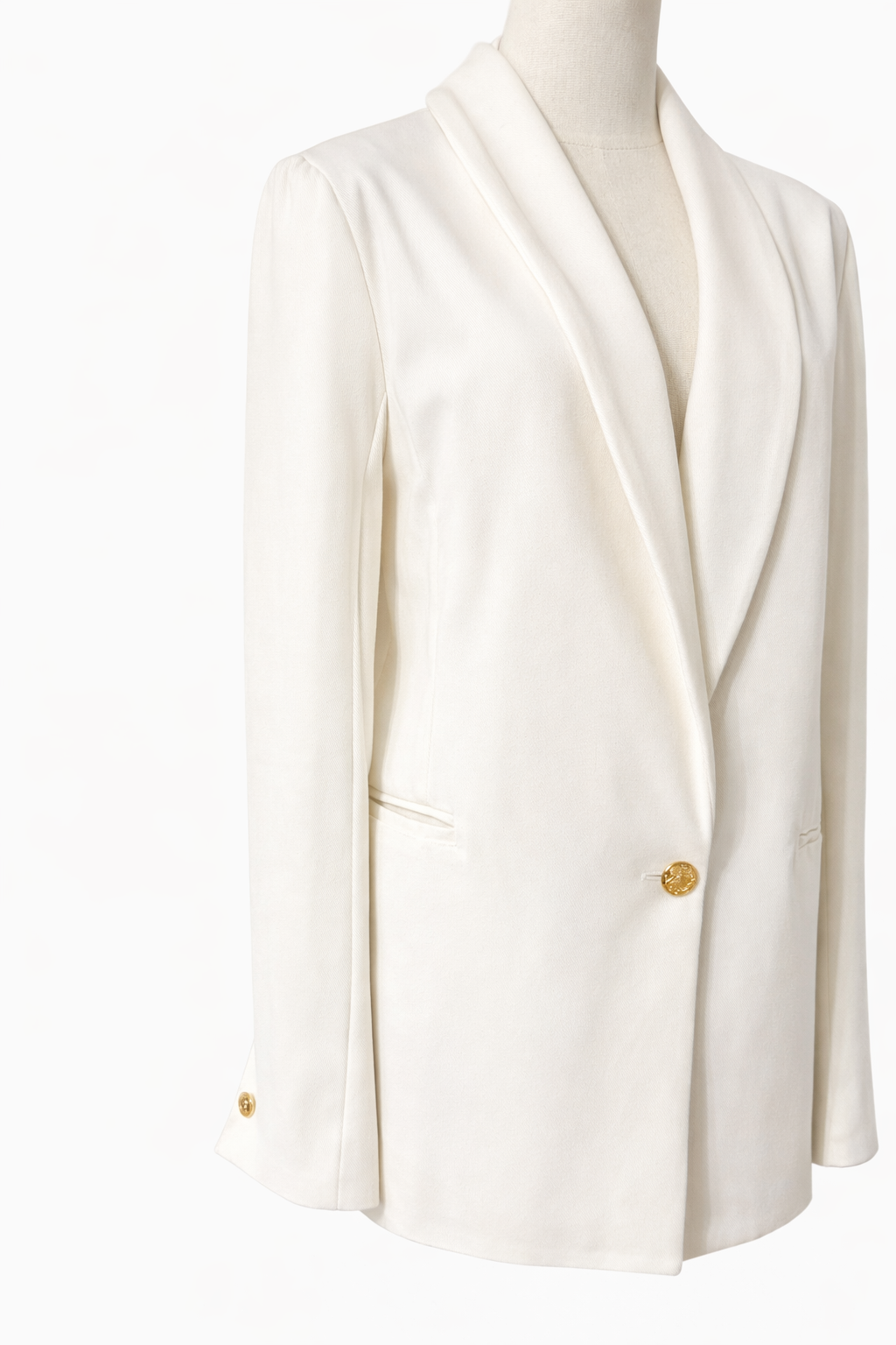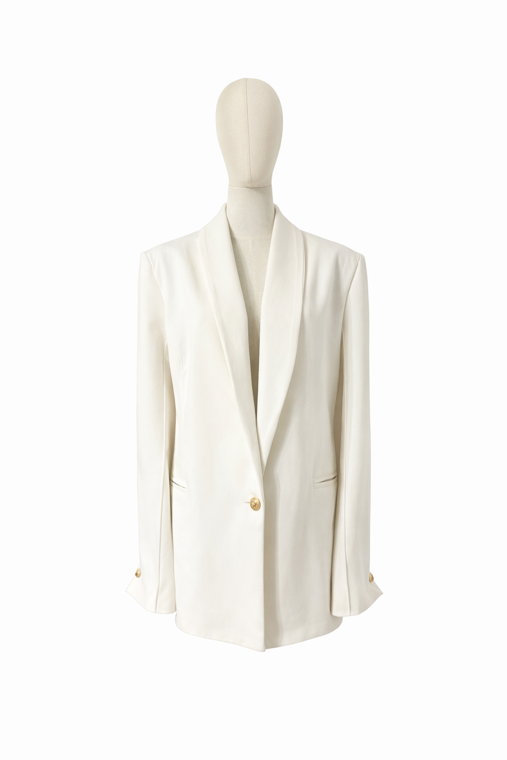 Designul minimalist este pus în valoare de reverul tip șal, care creează o linie fluidă și alungește silueta. Închiderea cu nasture metalic decorativ adaugă un accent subtil prețios, iar buzunarele discrete păstrează estetica curată a piesei.