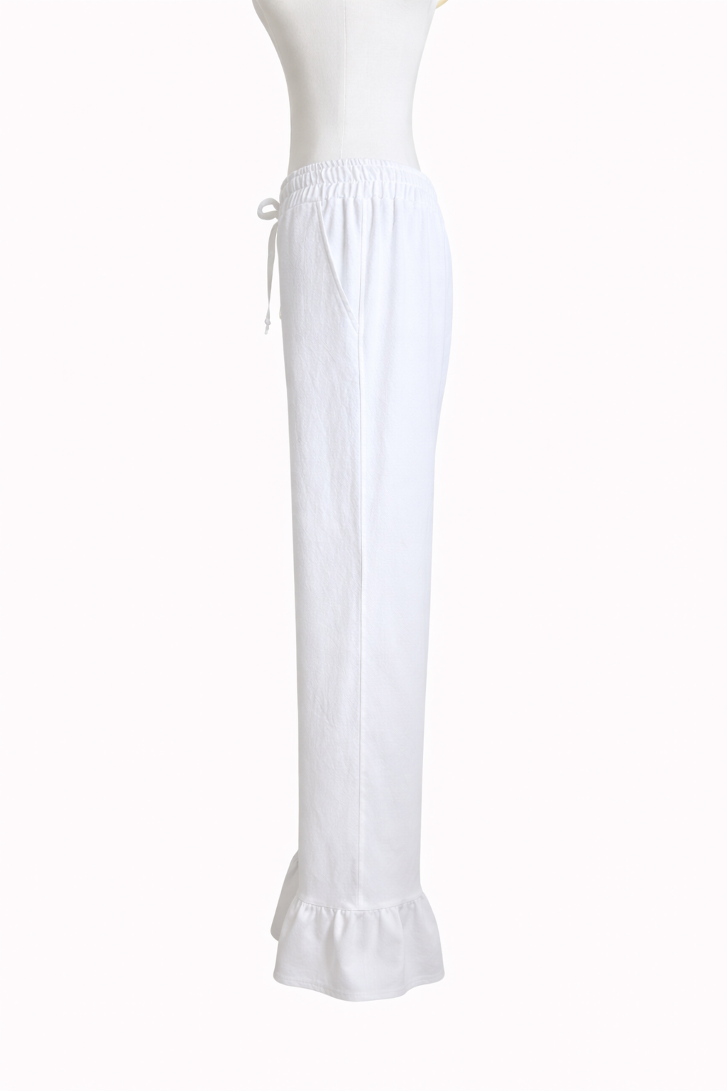 Croiala relaxată și talia elastică cu șnur reglabil asigură o potrivire confortabilă, în timp ce terminația cu volan discret adaugă o notă feminină și elegantă. Buzunarele laterale completează designul cu un plus de funcționalitate.