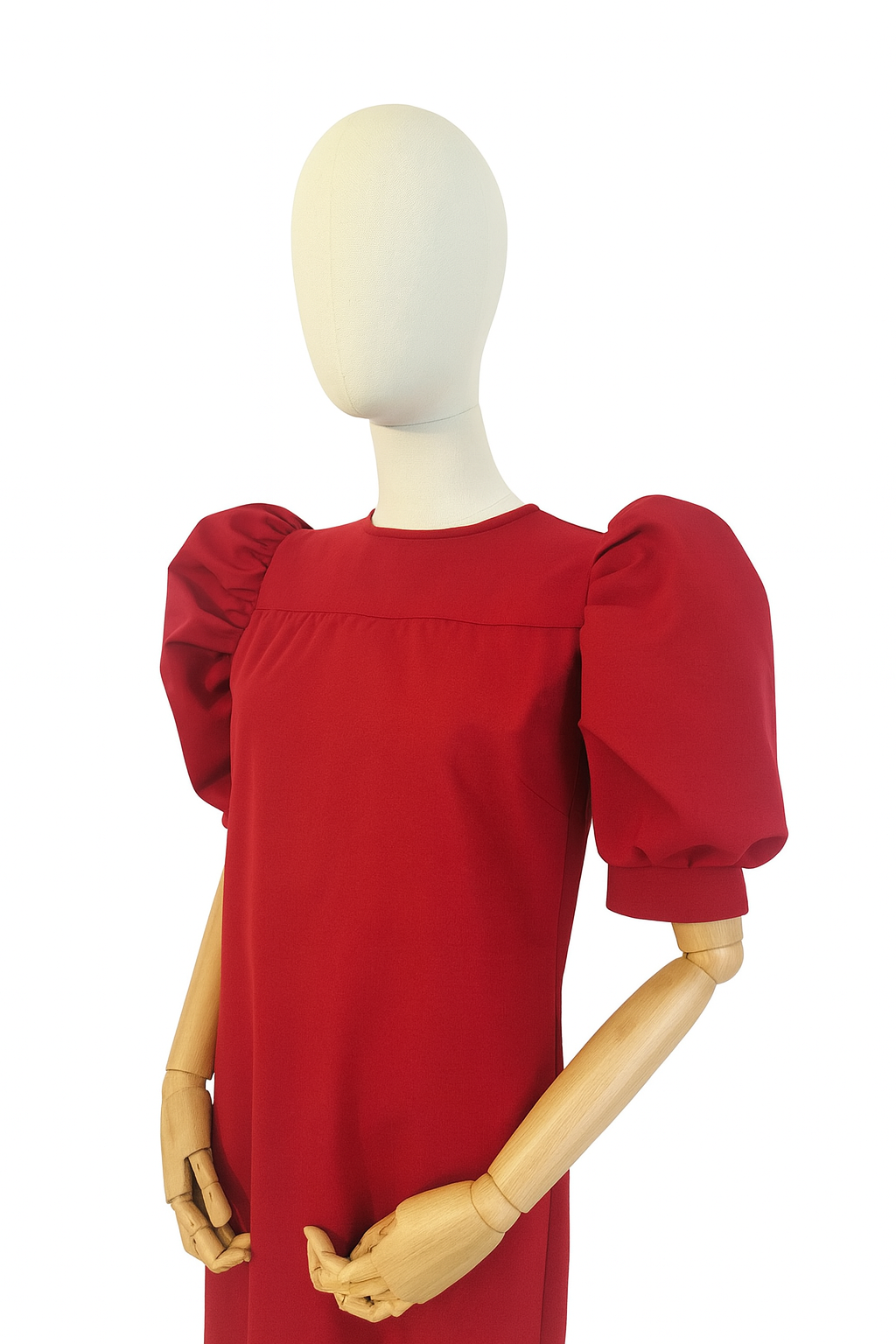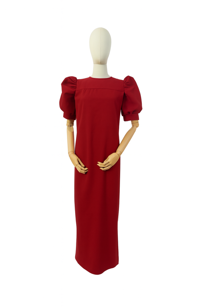 Rochie lunga cu croi lejer și mâneci bufante, realizată dintr-un material cu ținută și o nuanță intensă de roșu. Versatilă, confortabilă și ușor de accesorizat — ideală atât pentru zi, cât și pentru ocazii speciale.