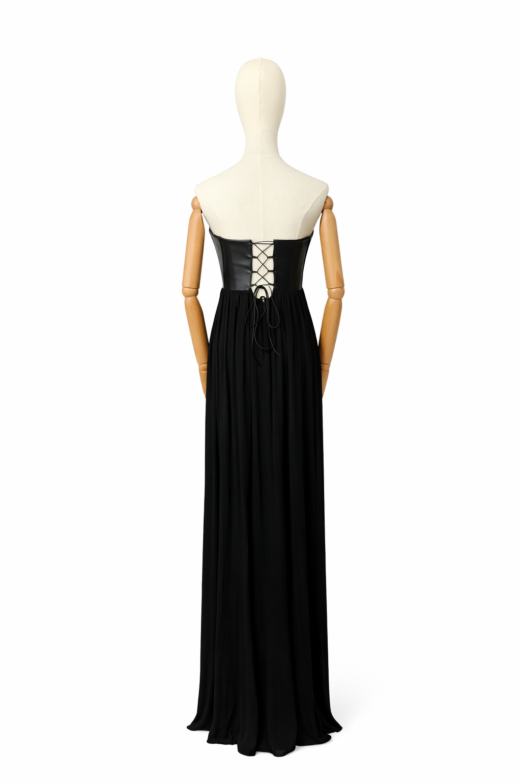 Corsetul din piele, realizat manual, urmează linia corpului și pune în evidență talia, oferind o structură grafică și o eleganță modernă. Spatele este definit de un sistem de închidere cu șiret, inspirat din detaliile couture, ce permite ajustarea perfectă pe siluetă.