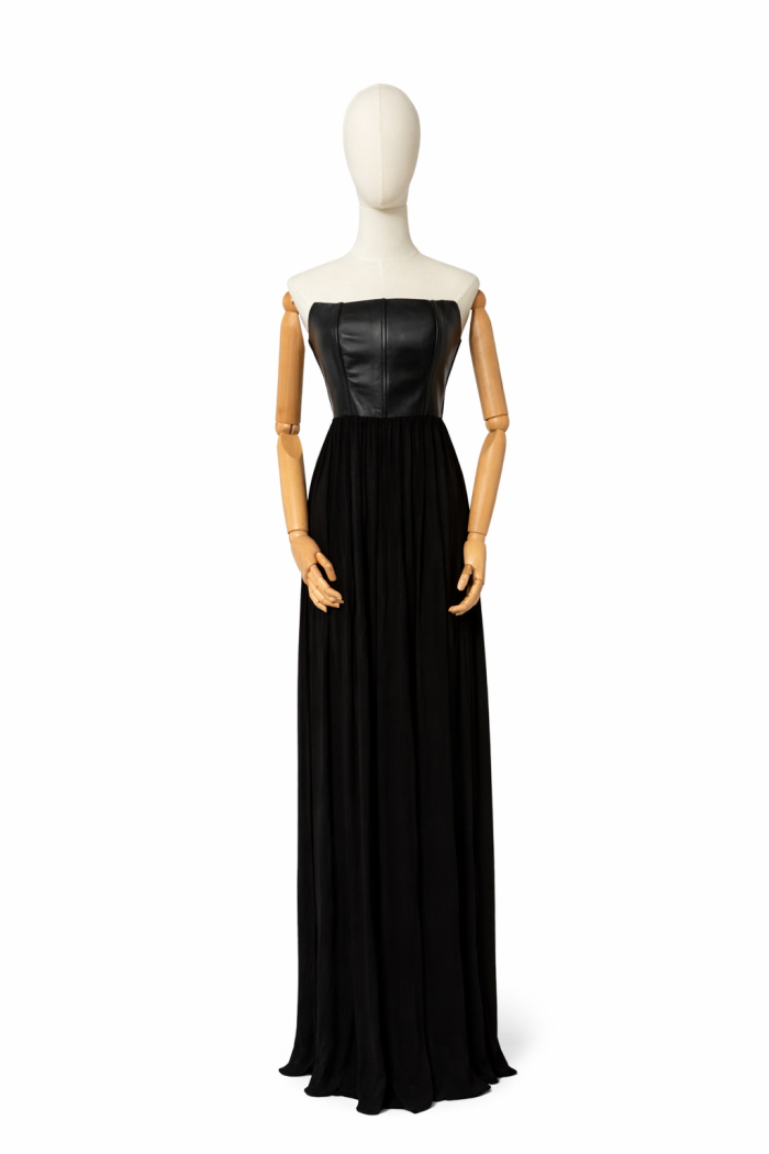 Rochie lungă, spectaculoasă, ce combină textura puternică a pielii naturale cu fluiditatea mătăsii fine.