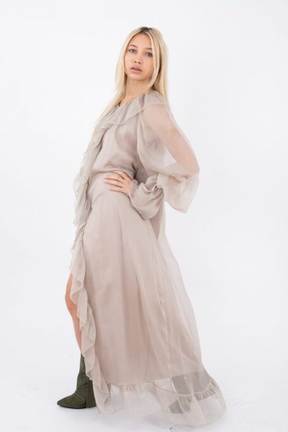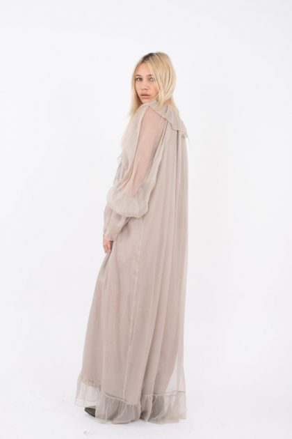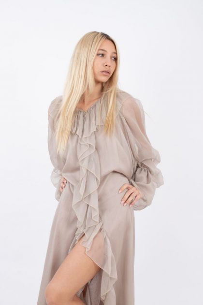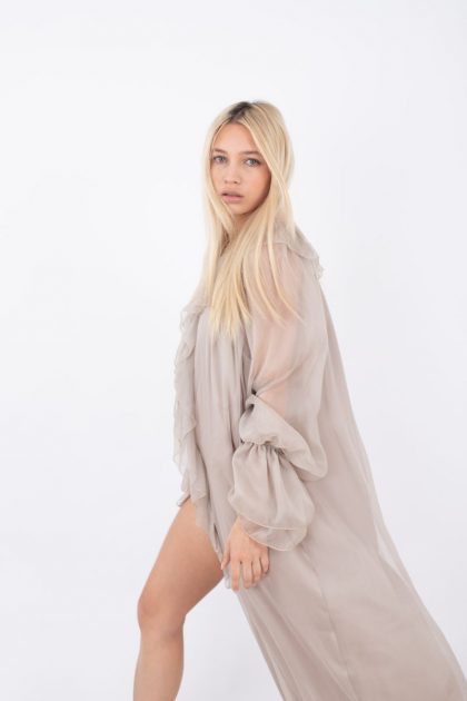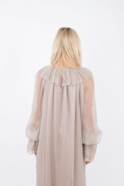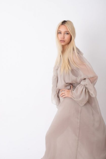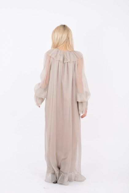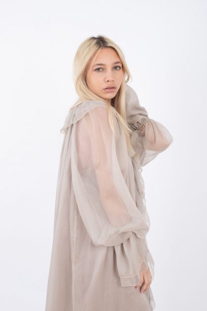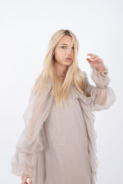 Confecționată dintr-o vâscoză fluidă, cu o textură delicată și cădere lină, rochia “Noir Éther” îmbină confortul cu rafinamentul minimalist. Croiul lejer și linia dreaptă sunt completate de mâneci bufante 3/4 cu manșete bine conturate, iar pliseurile fine din zona bustului adaugă un plus de romantism. Ideală pentru zilele în care vrei să arăți impecabil fără efort, această piesă se adaptează ușor de la casual la elegant.
