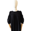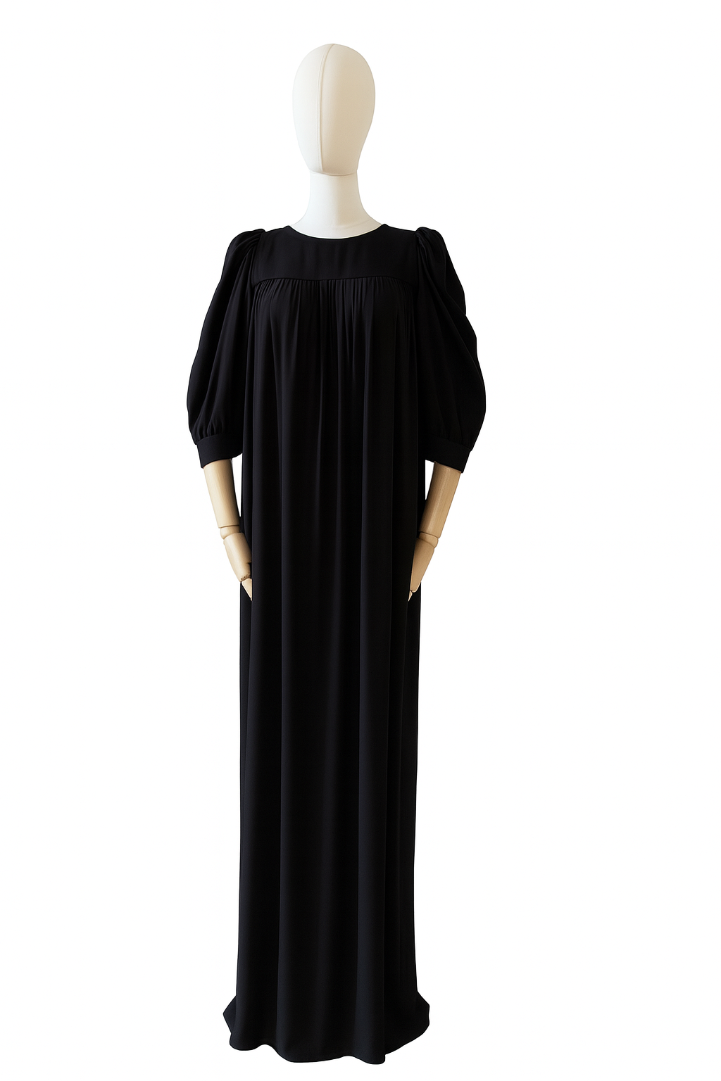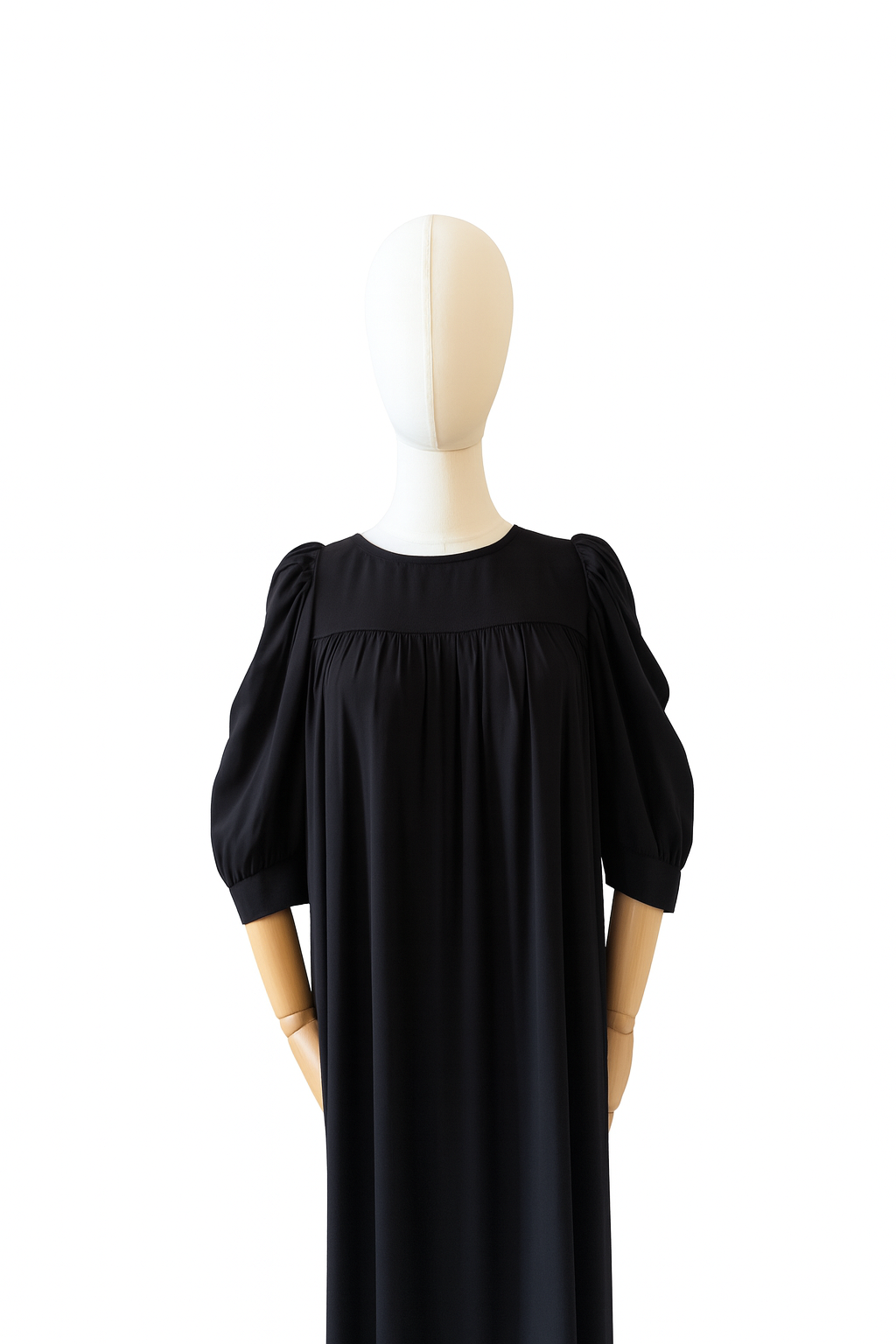 Confecționată dintr-o vâscoză fluidă, cu o textură delicată și cădere lină, rochia “Noir Éther” îmbină confortul cu rafinamentul minimalist. Croiul lejer și linia dreaptă sunt completate de mâneci bufante 3/4 cu manșete bine conturate, iar pliseurile fine din zona bustului adaugă un plus de romantism. Ideală pentru zilele în care vrei să arăți impecabil fără efort, această piesă se adaptează ușor de la casual la elegant.