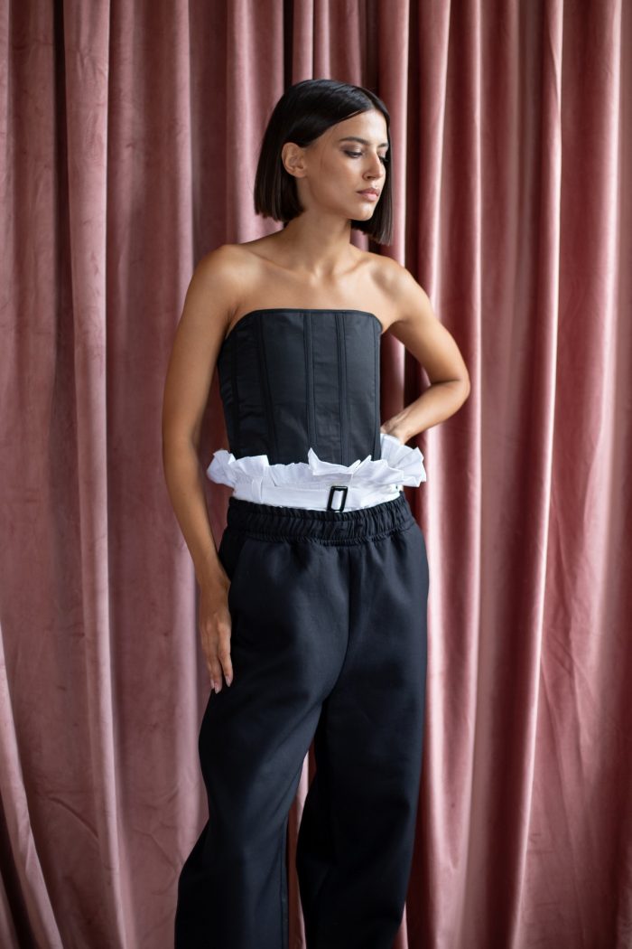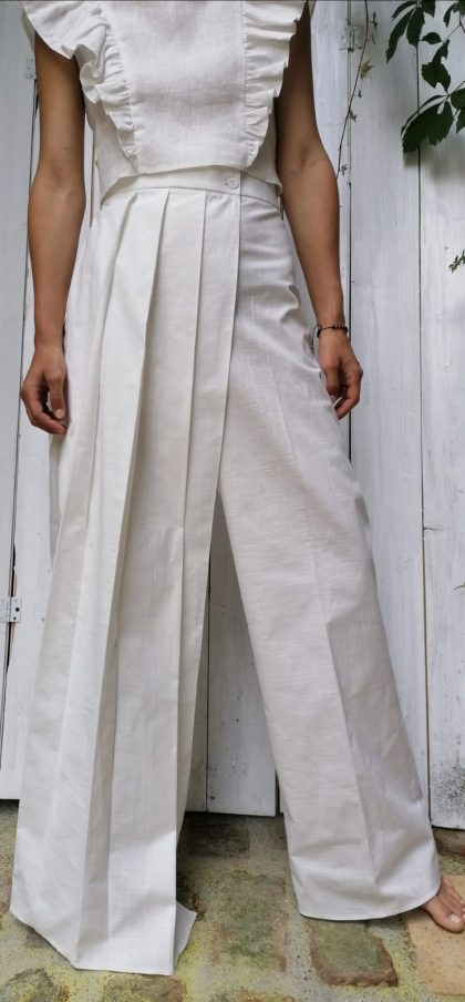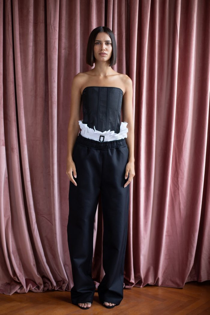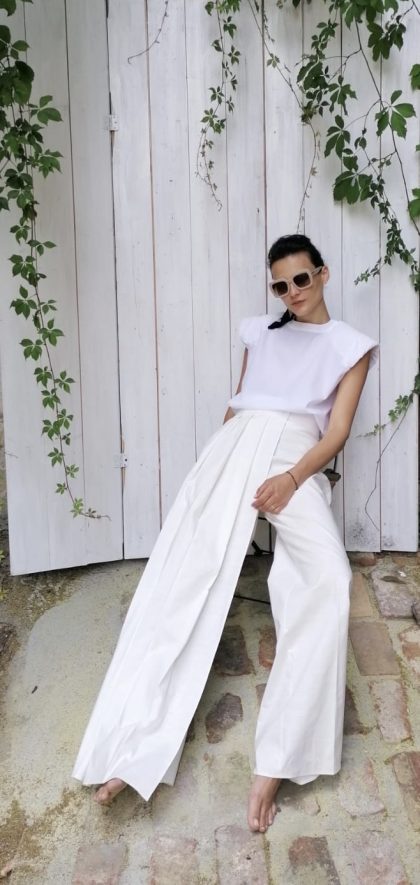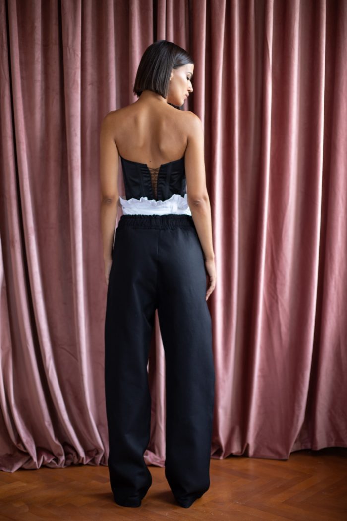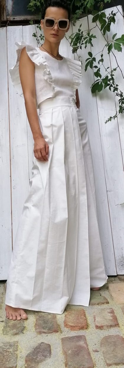 Pantalonii cu betelie dubla Zandra sunt realizati dintr-un bumbac plin, iar partea de sus dintr-un bumbac alb, terminatie cu volanas.