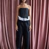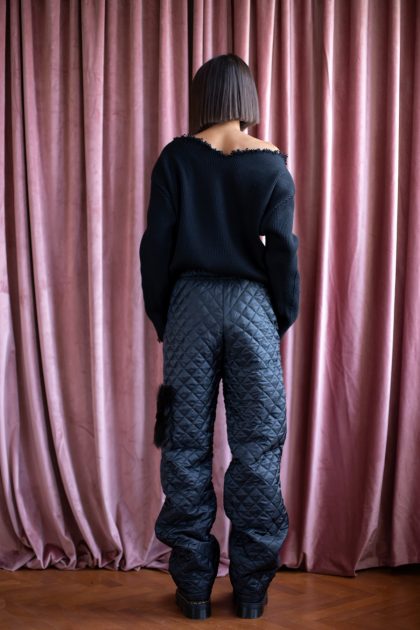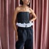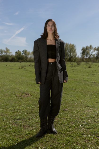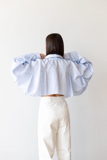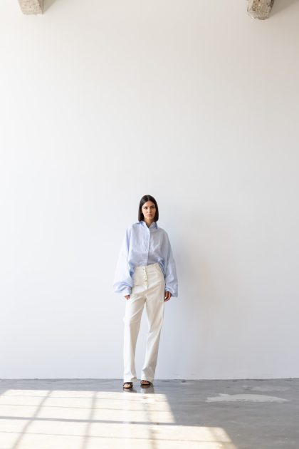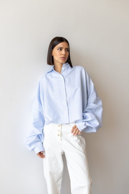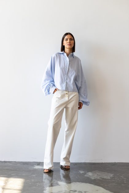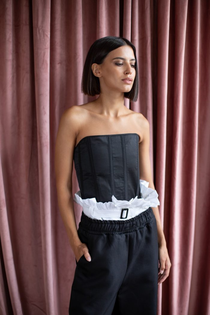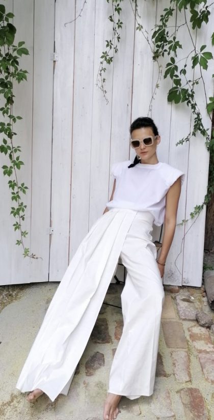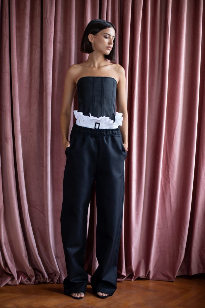 Pantalonii cu betelie dubla Zandra sunt realizati dintr-un bumbac plin, iar partea de sus dintr-un bumbac alb, terminatie cu volanas.