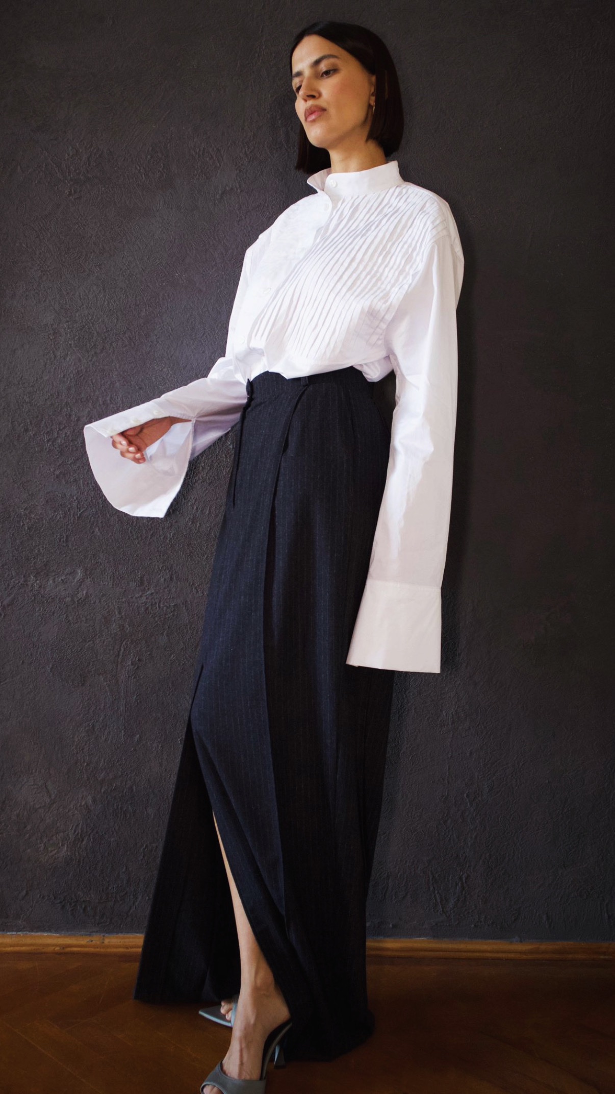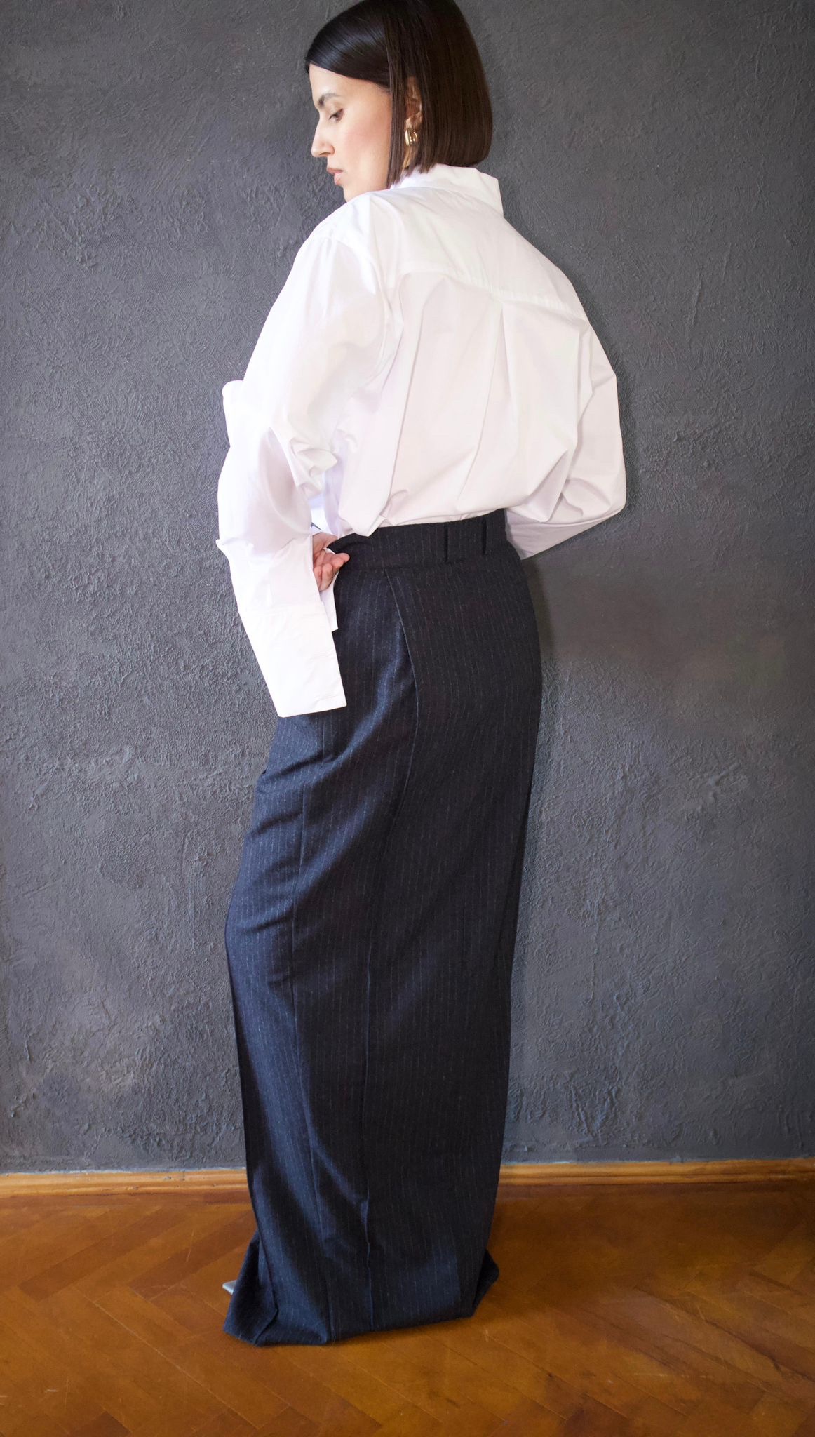 Fustă lungă din lână fină, cu dungi discrete verticale, croită pentru o siluetă elegantă și alungită. Are o betelie structurată și o deschidere subtilă în față, oferind libertate de mișcare și o notă rafinată de feminitate.