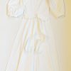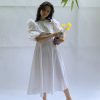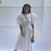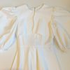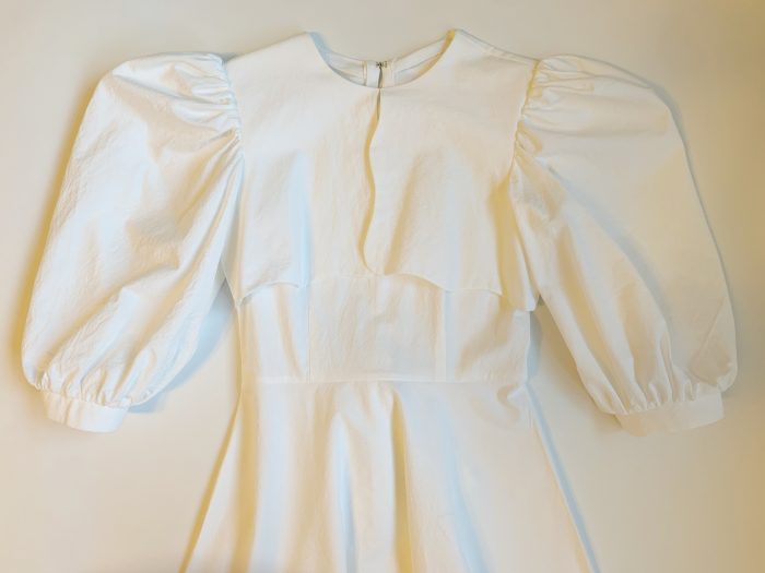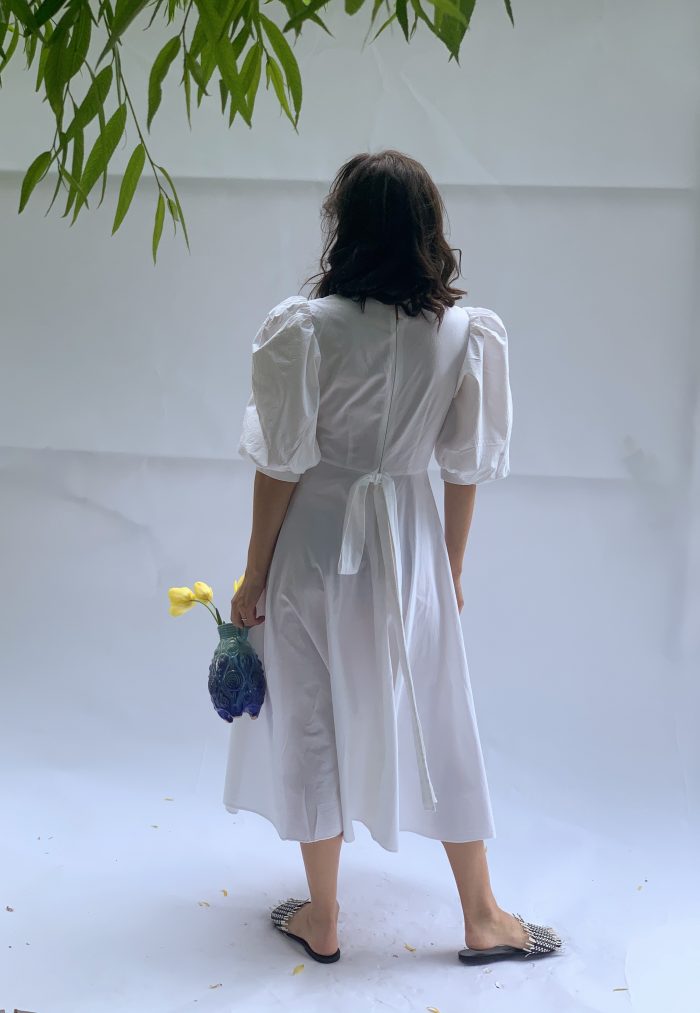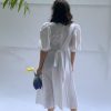 Rochia alba midi din panza naturala tesuta in Romania. Aceasta are o funda in partea din spate