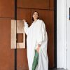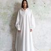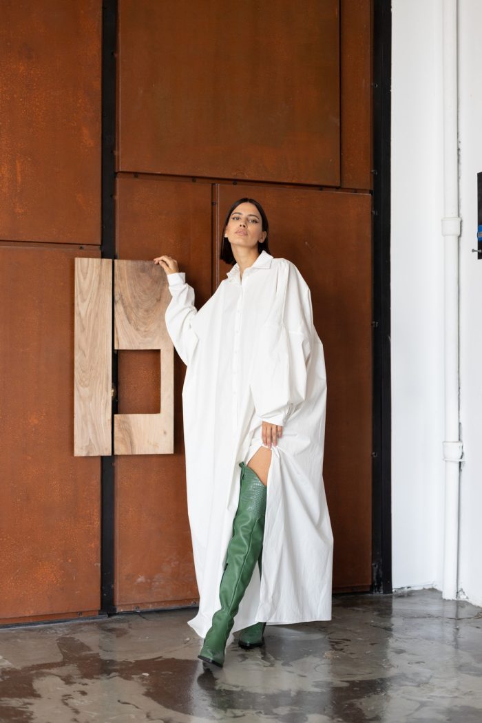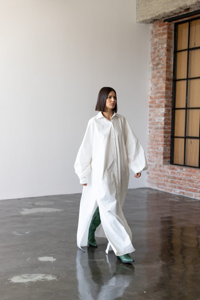 Realizată exclusiv din bumbac, rochia maxi este un stil clasic de cămașă, cu o siluetă lejeră,umeri cazuti si cusaturi laterale cu fante.