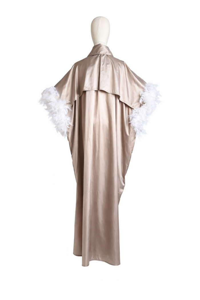 Designul este completat de pieptari dublați, decorați cu pene delicate, care adaugă textură și un accent spectaculos piesei. Gulerul clasic și linia lungă conferă eleganță și versatilitate, făcând din această capă o alegere ideală atât pentru apariții speciale, cât și pentru stylinguri îndrăznețe.